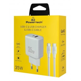 Powertech Φορτιστής 35W GaN με Θύρα USB-A και Θύρα USB-C και Καλώδιο USB-C - USB-C 35W Quick Charge 3.0 Λευκός (PT-1179)