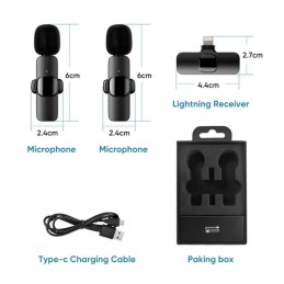 Ασύρματο μικρόφωνο Apexel K9 Lightning, κατάλληλο για παράλληλη καταγραφή ήχου, συνομιλιών, συνέντευξης, για επαγγελματική ή ερασιτεχνική χρήση. Η σύνδεσή τους είναι πολύ απλή και δεν χρειάζεται να εγκαταστήσετε κάποιο πρόγραμμα, απλώς συνδέστε τον δέκτη στο κινητό σας και περιμένετε λίγα δευτερόλεπτα για να κάνει σύζευξη με τα μικρόφωνα.